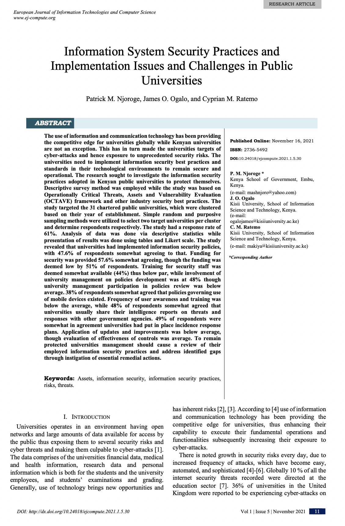Njoroge PM. (2020). A Framework for Effective Information Security Risk Management in Kenyan Public Universities. 2020.